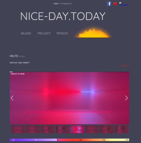 Die vorliegenden Daten stammen von nice-day.today und repräsentieren den täglichen Durchschnittsfarbwert der Wettervisualisierung für Wien. Das Farbsystem kodiert Wettereindrücke in RGB-Werte: Rote und orange Töne (hoher R-Anteil, niedriger B-Anteil) signalisieren warme, sonnige Tage — blaue und violette Töne (hoher B-Anteil) stehen für kalte, bewölkte oder niederschlagsreiche Tage.